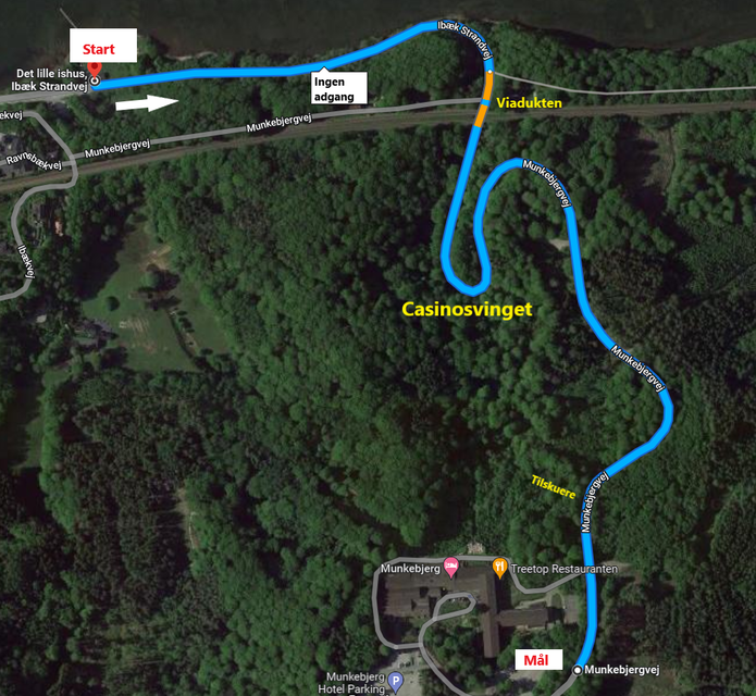 Du kan gå videre ned gennem skoven ad Munkebjergtrappen til Casinosvinget. Det er nok banens sværeste sving, som bare bliver ved med at dreje, og samtidig snævrer ind ved udgangen. Her er rå motorstyrke ikke nok – der skal også udvises god teknik for at komme godt igennem og videre mod det efterfølgende højresving.